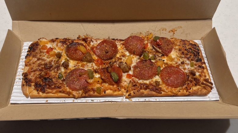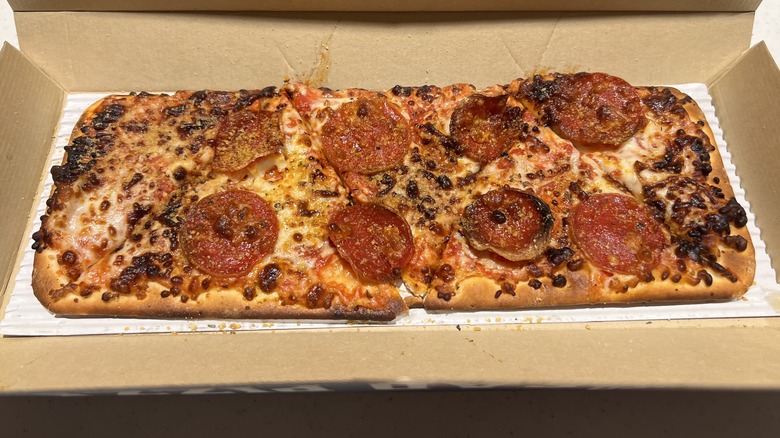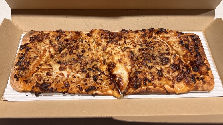 In 2017, AMC entered the pizza game and gave its product a real artisan name: stone-fired flatbreads. Despite its fancy name, it's essentially Domino's thin crust that eschews a round pie shape for a long, rectangular one. That helps for space when eating inside the theater, where slices are cut into five handy alternating triangles.