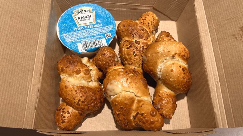 Out of the 24 items I tried off the AMC snack menu, a whopping 12 of them are pretzel-related. One of the newer versions is the jalapeño cheese stuffed pretzel knots, which dropped in the fall of 2023. These knots come four to an order and with a side of Heinz ranch dressing.