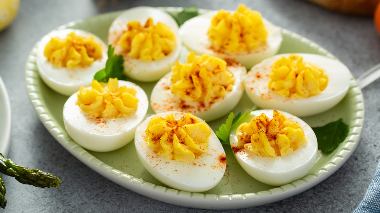 Hard-boiled eggs are halved to create deviled eggs, and their yolks are meticulously mixed with mayonnaise, mustard, and various seasonings to create deviled eggs. The resulting creamy filling is then piped or spooned back into the egg whites, creating a delightful blend of textures and flavors.