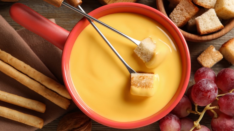 Fondue involves melting a mixture of cheeses, often Gruyère and emmental, with white wine and garlic in a communal pot called a caquelon. The result is a rich, gooey cheese sauce. Diners use long forks to dip pieces of bread into the cheese, creating a delicious and interactive dining experience.