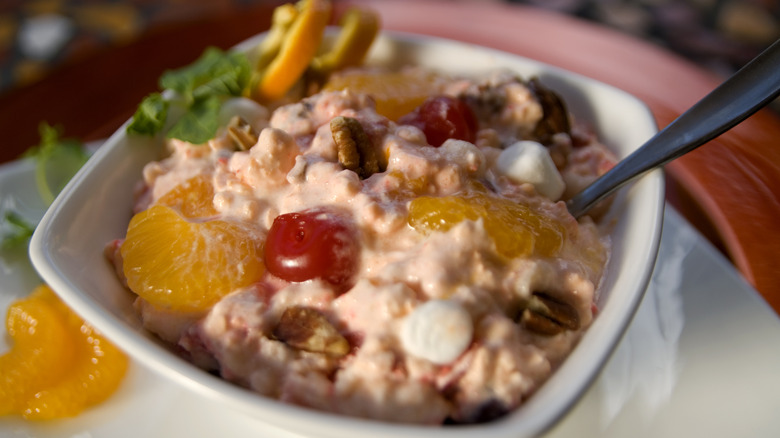 To craft a classic Jell-O salad, flavored gelatin is dissolved in hot water and then combined with an assortment of ingredients such as canned fruit, marshmallows, and sometimes even shredded vegetables. Once set, the gelatin transforms into a wobbly, translucent masterpiece, showcasing the vibrant hues of the included ingredients. This one is a little weird, but we think you can bring it into the modern era with some personal twists.