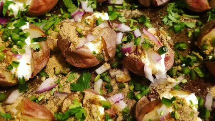 Here, the usual toppings are swapped out for vibrant ingredients like fresh ginger, Indian green chiles, and chaat masala. It's the addition of these new, flavorful ingredients that truly make this dish stand out from your run-of-the-mill loaded baked potato.