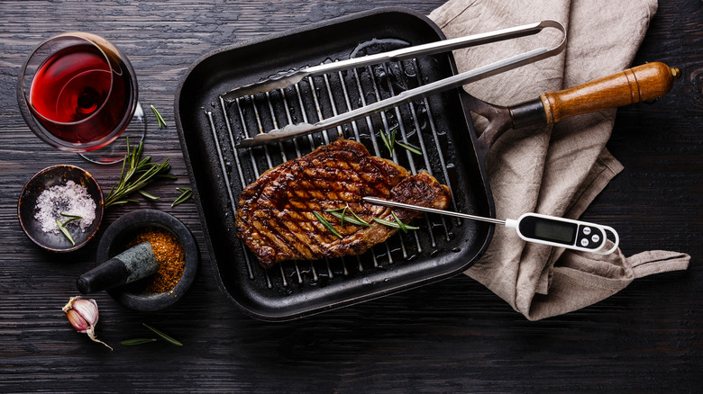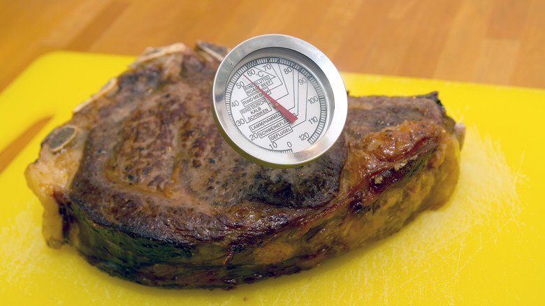 The best kind of thermometer for testing the temperature of a steak is a digital one that does not need to be regularly calibrated for accuracy. To register the temperature of your steak, insert your thermometer into the side of your meat at the thickest section of the cut. One downside to using a thermometer? The steak will leak juices from the puncture hole where the thermometer was placed.