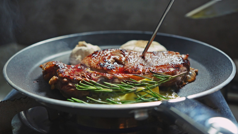 Start your steaks in a hot pan over high heat. Once you have seared your steaks on both sides, continue cooking until they have reached about 120 degrees Fahrenheit. Toward the last minute or two of cooking, add a pat of butter, fresh herbs, like rosemary or a sprig of thyme, minced garlic, and finely chopped shallots. As the butter melts, gently spoon it over the steaks, basting them to impart them with the aromatics and keep them moist.