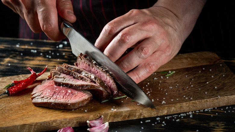 To get the most tender cut of meat, you should always cut against this grain or perpendicular to it. Doing so will cut these muscle fibers into shorter segments, which are easier to chew. Failure to do so can leave you gnawing at even a tender steak in perpetuity. Grab your sharpened chef's knife and make vertical incisions straight through these muscle fibers for the best bite of medium-rare steak you have ever eaten.