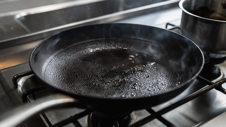 When a moist steak hits a hot pan, it drops the temperature of the surface of the cooking vessel, causing the meat to steam rather than encouraging the onset of the Maillard reaction. This process during which meat obtains its characteristic browned crust occurs at 280 degrees Fahrenheit. Because water is such an effective conductor of heat, it will take quite a while for excess liquid to evaporate and the pan to return to the optimum temperature for searing your steak.