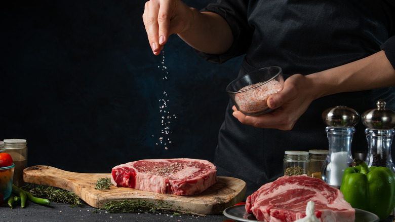 Once you have seasoned your steak, place it onto a baking sheet lined with a wire rack. Roast it low and slow in an oven preheated to 250 degrees Fahrenheit until the meat reaches 115 degrees Fahrenheit. Finish the steak by pan-searing it in a hot pan lined with oil for approximately a minute per side. The only disadvantage to cooking steak this way is that it takes slightly longer than other methods. That said, the consistency of this method may be worth the added time.