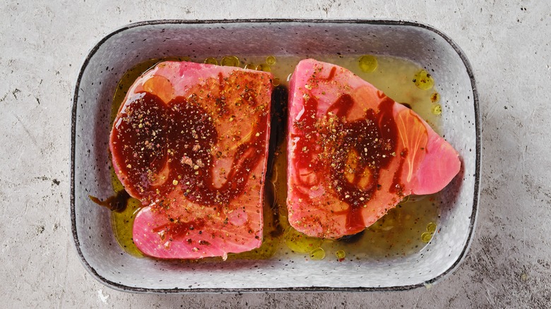 While seasoned tuna steaks can go in the air fryer as is, you'll want to shake any excess marinade off before popping them in. A little moisture won't hurt, but dripping liquids can damage your air fryer or cause a dangerous malfunction. And keep marinade time at about a half-hour (one hour at the absolute maximum) — any longer and your fish could get soft and squishy.