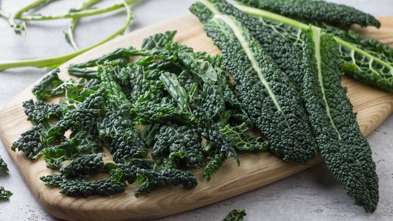 When you've successfully removed the stems from your collard greens, turn the leaves longways and cut them into long strips before cooking. The most classic way to prepare these nutritious greens is by incorporating some essential seasoning and cooking them long enough so that they transform into a tender, mouthwatering side dish. Since raw collard greens have a sharp flavor, when cooking, add enough salt and include a little acidity, such as vinegar, to balance out their resulting flavor. As far as cooking time goes, add your prepared greens to various meat-based dishes and braise them for up to two hours. Conversely, if you're after a tasty stand-alone side dish, quick bacony collard greens may be a recipe worth trying since the included greens only need to meld with the added bacon for 20 minutes before serving.