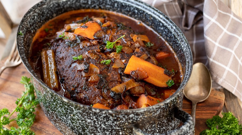 A Sunday pot roast is a great way to make a hearty meal that will bring everyone together at the dinner table. But, since the average chuck roast hovers at almost $8 per pound, and can take up to four hours in the oven until it's tender enough to eat, it doesn't exactly work if you're tight on time or money. Luckily, if you're craving a pot roast but have limited time or a limited budget, there's a solution. All you need is some ground beef.