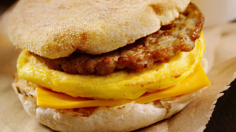 To build on the simple combination of eggs, salt, and pepper, you can also add ingredients like baking powder and water to your egg patty. This pairing creates a slightly fluffier egg patty, which is ideal if you want a patty that's not taking over the sandwich — unlike some of the doorstop varieties you may catch at popular brunch spots. This light and fluffy egg patty would pair well with an English muffin.