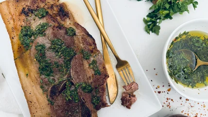 - Remove from heat, transfer to a plate, and pour about 2–3 tablespoons of chimichurri over the top of the steak.