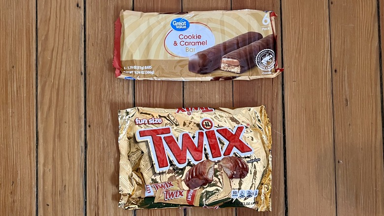 In general, a pack of Twix always seems like an actual great value, as you're getting two bars instead of one. Even if the weight of two bars equals that of one Snickers, the more to see and eat will always be the merrier. Walmart's own golden packaged version is simply called Cookie & Caramel Bars, and with two bars inside, they would be a bit catchier if they were called Deux-o.