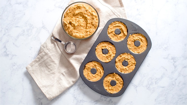 Most donut recipes call for a yeasted dough, so depending on whether you're making standard donuts or a thicker cake-like variety, you may or may not need to use additional leavening agents like baking powder and baking soda. Finding your ideal recipe will ultimately determine the overall texture of your baked donuts. Furthermore, having the right pans and following some essential tips will help you achieve evenly cooked donuts that don't fall short of flavor. Before revealing a few simple ways to streamline the process of making baked donuts at home, let's uncover some basic steps that will ensure tasty success every single time.