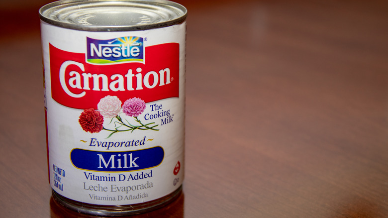 Evaporated milk is a mainstay of grocery store baking sections, where you'll typically find it in small cans. According to Healthline, evaporated milk contains all the essential nutrients of regular milk but has far less water. Consider that whole milk consists of approximately 87% water, in addition to fat, protein, and other elements.