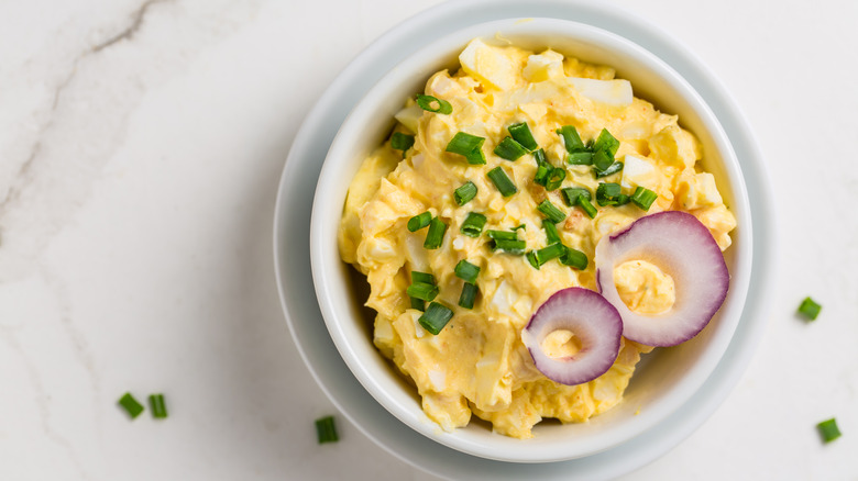 Fortunately, if the idea of making the classic dish seems too labor-intensive, or you're looking to put a twist on deviled eggs, deviled egg dip is a convenient alternative. It consists of the same ingredients as the classic hors d'oeuvre, including mayonnaise, paprika, herbs, and mustard. But instead of turning them into a pipe-able filling, you mix everything, including the egg whites, together to form a dip that tastes just like deviled eggs.