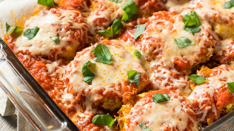 There's a whole world of eggplant varieties to choose from, but the type that is most commonly used stateside is the Globe/American eggplant. When wandering the produce section, the first thing you'll notice about these nightshades is the deep purple color of their skin. Like most fresh produce, you ideally want the skin to be smooth and free of any blemishes or wrinkles. Either could be a sign of the eggplant growing old, getting damaged, or being taken care of poorly. Instead, eggplant skin should have a shiny luster to it — showing that it's been freshly harvested and properly stored. Once the skin is in the clear, you can check for a few other key signs of freshness as well.