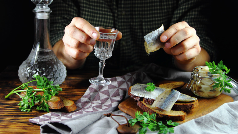 If you're positively hell-bent on experimenting with seafood-infused booze at home, you might try using cured ingredients for concentrated flavor. Los Angeles restaurant Bar Moruno's salmon martini utilizes booze imbued with the umami essence of smoked fish. Speaking with Saveur, bar manager Dave Kupchinsky explained his process. "I take smoked salmon and infuse it into Tanqueray gin. That sits for about three weeks, then I strain it off, including a lot of fat—but you have to leave some of the fat because that's where all the flavor is," he said.