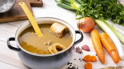 It's important to note that bone broth is different from traditional broth. Traditional broth is made by simmering meat, with or without bones, vegetables, herbs, and spices for one to two hours. Bone broth, on the other hand, is made by simmering animal bones, connective tissues, and ligaments, along with vegetables, herbs, and spices for up to 48 hours. This extended simmering process draws out more nutrients than its traditional counterpart and yields a broth with a more concentrated flavor.