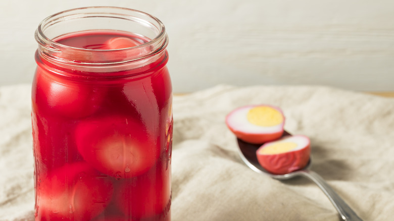 Eggs are good candidates for pickling because they're rather plain in flavor and take on other flavors very well. As with pickled vegetables, the pickling brine can be changed to suit individual tastes. Some add sugar for a hint of sweetness, but you can also include spices and aromatics like chili flakes, turmeric, bay leaves, or curry powder to the pickling liquid. You can even spice it up with firey peppers — jalapenos are a common addition. Beets are also sometimes used and the resulting flavor is earthy and slightly sweet, with an added tang from the vinegar. Just remember that anything you add to the pickling liquid will color the egg, so if you use turmeric or beets, don't be alarmed when you check on them in a few weeks to find them yellow or pink. You can also keep it simple with dill-pickled eggs, which use the same ingredients as dill pickles.