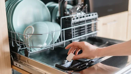 They shared that moisture may make the pod's exterior sticky, so you should wipe down the inside of the detergent dispenser before placing the pod in. You should also make sure your hands are completely dry before handling them. Additionally, large items — like plates or cutting boards — in front of the dispenser door could block water from getting into the dispenser, and it could force the door to stay shut. This can ultimately prevent the dishes from getting clean.