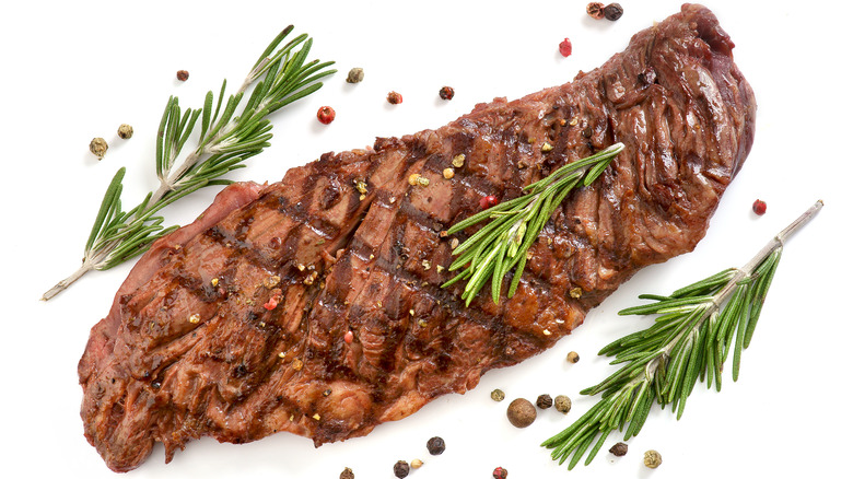 Regardless of what you're making it with, the most important part of skirt steak is how you cook it. And that means using the highest heat possible. The thinness of the meat makes its middle prone to overcooking, so you don't want to wait around for the outer part to brown or sear any longer than you have to. For something that is a mere ¼ inch to 1 inch thick (depending on how it's cut), it's remarkably difficult to get a good crust unless you use super-high heat. Anything less, and it'll come off the grill or out of the pan looking almost like it's been boiled — and that's definitely not what you're going for.