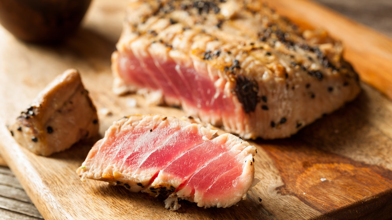 There is one important thing to keep in mind, however. And that's that tuna steaks, like all meat, need to sit out for a little bit before you get to cooking them. This isn't a step that you want to skip as it will affect the end result even more so than with beef or pork due to the short cooking time. While it's understandable if you're feeling concerned about food safety, there's actually no need to worry. It won't take too long to bring the fish to room temperature — which is necessary for properly cooked tuna steaks — far less time than the maximum of two hours allowed by the USDA anyway.