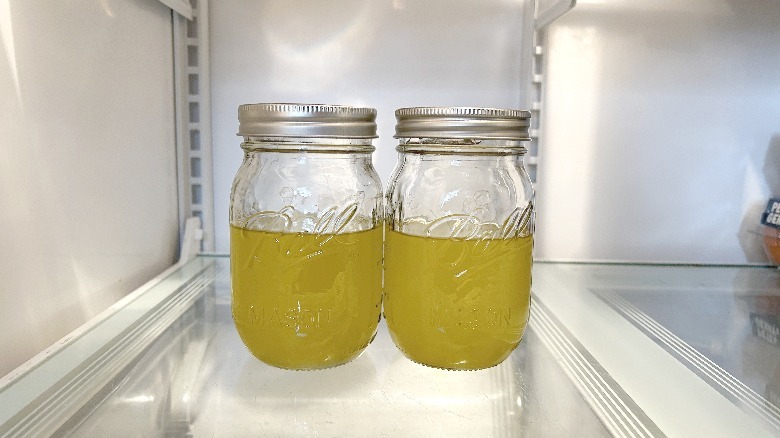 Always store herb-infused and herb oils made from fresh herbs in the refrigerator. Though they may solidify a bit, they can quickly be liquefied at room temperature. When properly stored, they will last for about a week. Keep an eye out for cloudiness, odors, and any mold that may form around the edges of the jar.