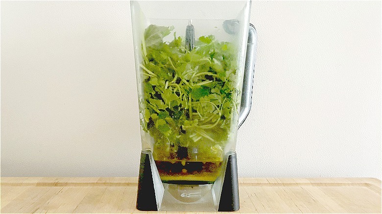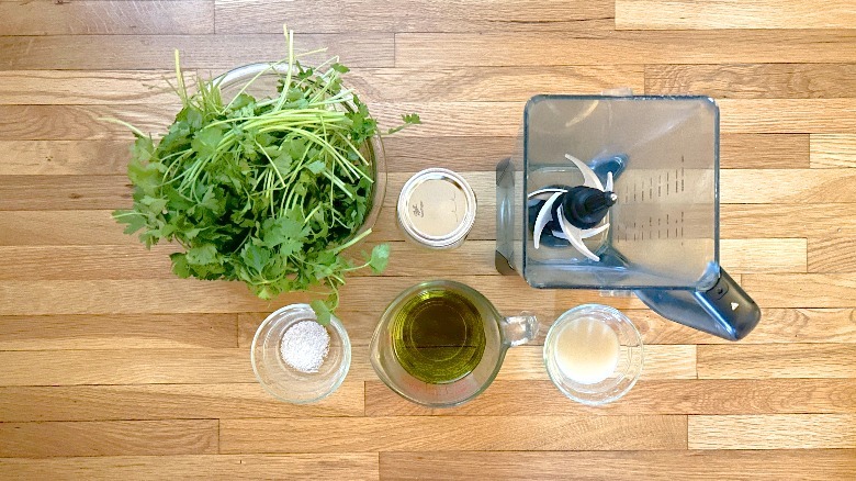 Place the cleaned herbs, lemon juice, oil, and salt in a blender or food processor. Purée the ingredients.