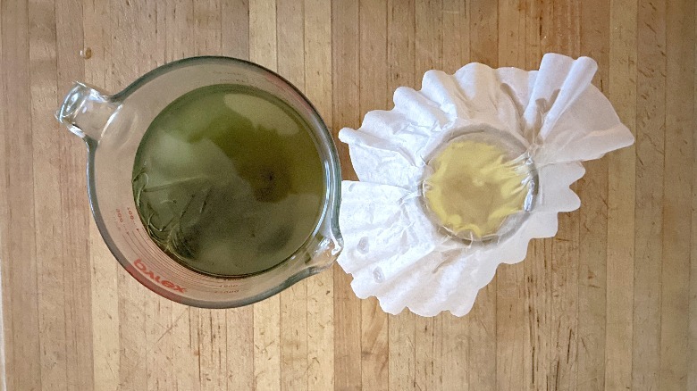 Tuck the coffee filters into the tops of the sterilized mason jars or top the jars with cheesecloth. Strain the herb-infused oil through the coffee filters or cheesecloth into the mason jars a little at a time until all of the oil has been filtered.