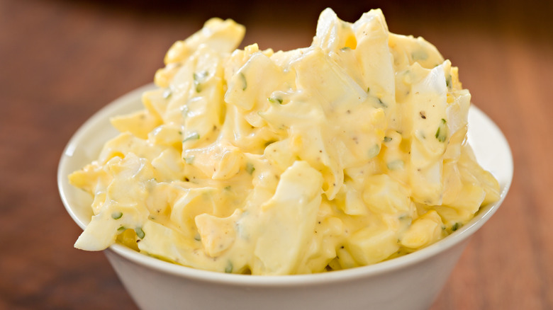 Aside from the egg salad's texture, the other reason for correct cooking is foodborne illness. According to the CDC, eggs can carry salmonella thanks to the chicken that laid them. This salmonella can be present on the outside of eggs if they came into contact with chicken droppings, or it can be present on the inside because the chicken who laid the egg was carrying the illness. To avoid this problem, the CDC recommends using pasteurized, refrigerated eggs. Don't use any eggs that are cracked.