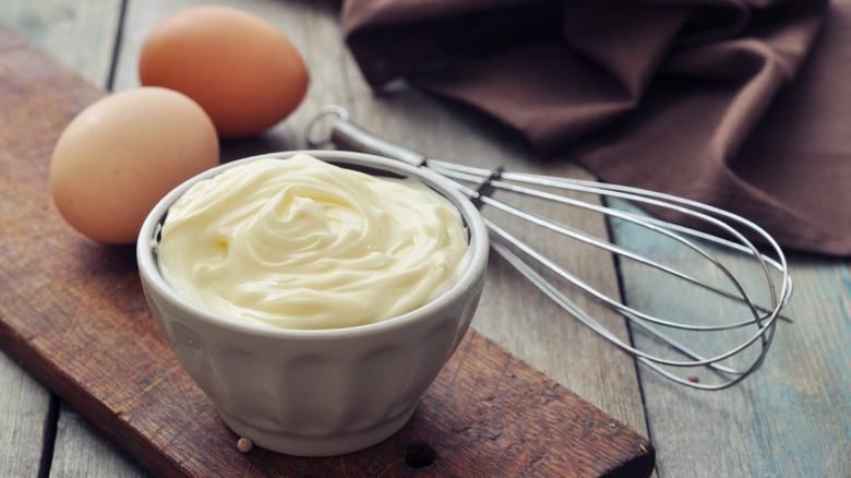 To make egg salad, start by boiling some eggs. They should be hard-boiled, which means that you need to cook them for around 10 to 12 minutes. Once the eggs are ready, chop them up roughly, leaving them chunky. Next, add as many chopped onions or finely chopped celery pieces as you'd like, and grab the mayonnaise. Here, you have several options like whole egg mayo, reduced fat mayo, or mayo with olive oil, so choose the one that best fits your goals (and diet plan). This writer usually measures mayonnaise with her heart, but if you want to measure it with a measuring cup, you'll need around ½ cup for every eight eggs you put into the mixture. Add a bit of mustard here, too, if you like a little zing.