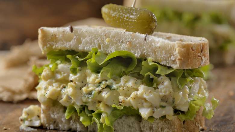 When asked for a way to improve a "mediocre" egg salad, egg salad enthusiasts in the r/Cooking section of Reddit stated that the secret is to add some sweet pickle juice or relish, or even chopped pickles. Other add-ins like onion, celery, and scallions were touted as being a must-have as well, and many users encouraged experimenting with mustard by using Dijon or powdered mustard instead of the plain yellow kind. If you want to spice things up even more, add some powdered Italian dressing mix or horseradish. If you love deviled eggs, you can make an egg salad version of them by adding smoked paprika and even tuna.