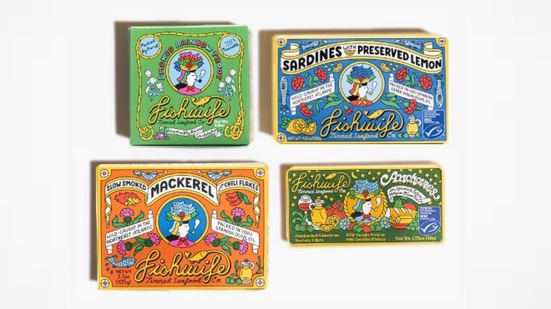 The tinned fish from Fishwife comes boxed in colorful packaging with eye-catching illustrations. The visual presentation of the products seems to have played a significant role in the success of the business, as the packaging aesthetically distinguishes Fishwife products from other canned fish products on store shelves. Millstein told Marketing Brew, "The visual of what it was going to be, it just kind of struck a chord with consumers very, very quickly."