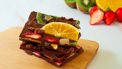 Whether it is dark and semi-bitter or milky and rich, adding dry fruit to chocolate imbues this crunchy dessert with a balancing tartness complemented by gentle whispers of natural sweetness. Dehydrated fruit provides chocolate bark with a pleasant textural contrast between the firm, yet breakable quality of the bark and the luxurious chewiness of the fruit. It's not just the flavor and texture of chocolate bark that is improved by adding dried fruit to the mix, they can also add depth to the visual aesthetics of the dessert as the bright colorful fruits will stand out against the backdrop of the chocolate.