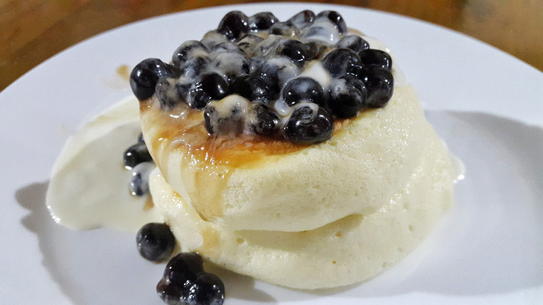 Like the original boba tea drink, boba pancakes also hail from Taiwan. Although boba pearls are delicious with almost any type of pancake, for the most authentic experience you might want to go all out and prepare soufflé pancakes. Soufflé pancakes are generally thicker than regular pancakes. They're also much lighter and fluffier — and noticeably jiggly. Along with a thick layer of cream, the combination of boba pearls and soufflé pancakes create an elevated breakfast (or brunch) experience, full of rich flavors and exciting textures.