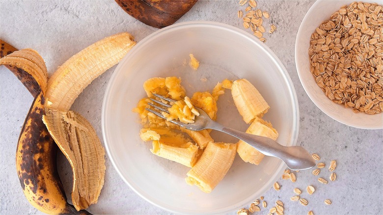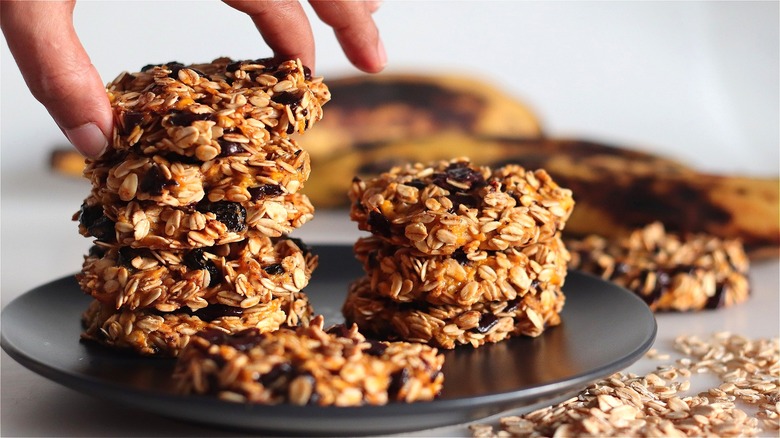 Sure enough, you can create healthy and filling banana oatmeal cookies by combining just bananas and oats. With enough ripe bananas and the right type of oats, you can easily form this mixture into cookie-like patties and bake them into convenient, tasty treats in no time. The best part about these delightful snacks is that once you've found the correct ratio of mashed banana to oats, you can get creative with these naturally sweet treats and add all sorts of extra ingredients. Before we reveal some mix-in suggestions, what exactly do you need to know before you attempt to make your own two-ingredient banana oatmeal cookies?