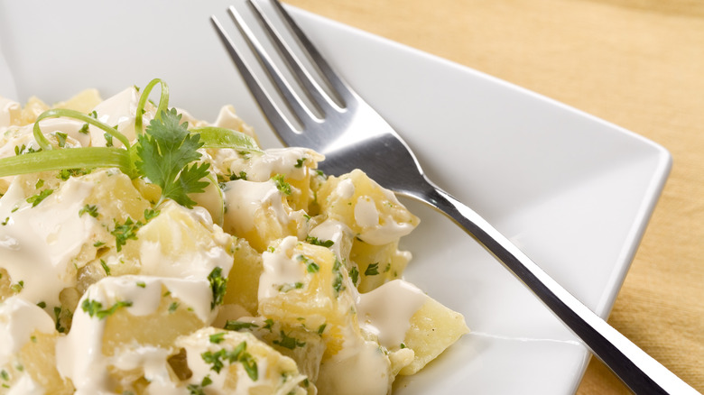Now that you have your potato salad secret weapon on hand with Caesar dressing, don't count out a few other ways to help your potato salad go the distance. For all the mayo-phones out there, there are plenty of great ingredients to add to your potato salad that can replace mayo and shake up the usual potato salad recipe. You can swap out the mayo for another salad dressing favorite: ranch dressing. The silky ranch delivers in creamy texture while also adding extra seasoning that mayo lacks. Even a packet of ranch seasoning can upgrade your potato salad in a pinch. Great fragrant toppings like sliced green onions are essential for adding extra dimension to a potato salad as well.