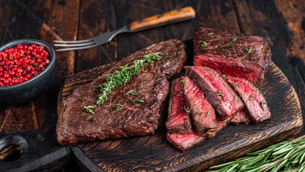 Both steaks should be cooked in the same way, however: Over a high, intense heat. The goal is to get a hard sear on the outside while leaving the inside medium rare to medium. You also can't help but notice the thick, vertical fibers of skirt steak that run the length of the steak. This is important when it comes time to slice it. Whether you're cooking an inside skirt for your homemade fajitas or ordering up an outside skirt at a restaurant, be sure to slice thin pieces against the grain, which will give your bites the perfect texture that's not too chewy.