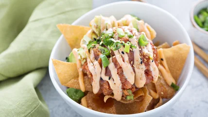Like traditional nachos, poke nachos are built on a crunchy bed of chips piled high with toppings and covered in sauce. While tortilla chips can work fine, crispy wonton chips offer an even flakier texture that's perfect for eating with pieces of fish. Without melted cheese, poke nachos rely on a sticky sauce to coat the toppings. Sauces will vary, but they are usually predominantly spicy, sweet, or umami.