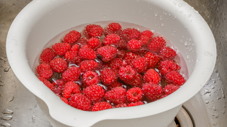 If you have a large haul of fruit from the store or farmer's market, you can plug up the sink and create your soak right there. Fill the sink with cold water and add a few tablespoons of baking soda. If you're using a bowl, then 1 teaspoon of baking soda for every 2 cups of water will suffice. After your hands themselves are washed, add the fruit to the mixture, swirling them around and letting them soak for as long as 15 minutes. Be careful, any more time than that and the slightly abrasive baking soda could begin to eat away at your fruit's skin and change the texture.