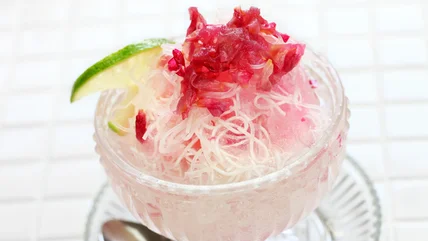 These aren't Italian-style noodles like spaghetti, made from durum wheat flour (although even early pasta dishes tended to be sweet). Instead, fāloodeh uses noodles like vermicelli or cellophane (sometimes known as glass) noodles; alternatively, they can be made from wheat starch. Cooked to absorbent, chewy perfection, they're bathed in a sugar and rosewater syrup, chilled until half-frozen, doused with fresh lime juice and sour cherry syrup, and often served with garnishments like chopped pistachios, fresh berries, and mint.