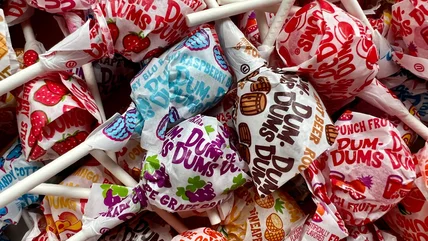 Dum-Dums were a true penny candy, initially running the full gamut of candy flavors, including anise, butterscotch, cherry, chocolate, grape, lemon, lime, orange, raspberry, and even root beer. In 1953, Spangler Candy bought the Dum-Dum brand from the Akron Candy Co., and within six years was producing 2 million lollipops a day. The colorful wrappers of Dum-Dums have always been eye-catching and, for almost six decades, they could be traded in for toys thanks to the company's "Save Wraps For Stuff" program.