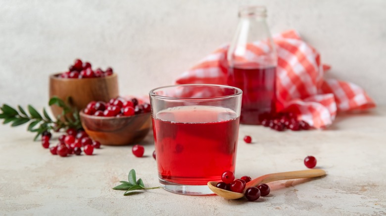 The third kind of cranberry juice is the one that you'll most want to mix into your sweet tea: 100% cranberry juice. This juice is made from a mix of cranberries and a blend of other fruit juices, typically grape, apple, and pear. When these fruit juices are blended with cranberries, they make the result more tolerable to drink because they soften the bitterness of the cranberries — but without the same kind of sugar hit as cranberry juice cocktail. Make sure you get your 100% cranberry juice from one of the best cranberry juice brands while you're at it.