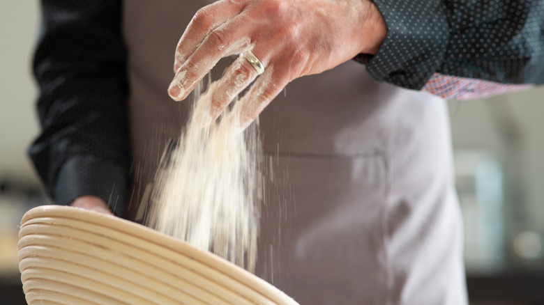 This thorough cleaning process is important for maintaining your banneton when a thick flour crust starts to build up, but you don't need to wash it every time you use it. A thin layer of flour is crucial for ensuring the dough doesn't stick to the container and can be easily removed after the bread proofs — adding that layer is called "seasoning" or "conditioning" and needs to be done before you start baking. To season, you'll mist the basket with water, dust the banneton with flour and work it into the grooves, then gently tap out the rest. This should be done when you first get your basket and after every wash.