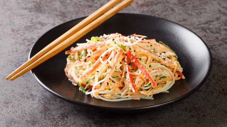 This easy salad lends itself to a huge range of extra ingredients. If you're craving a bit of extra sustenance, mixing in thin rice noodles or glass noodles can provide some valuable carbohydrates and give the salad a slightly more slippery texture. You can also add in any other shredded vegetables you like, such as zucchini or cabbage, or some fresh beansprouts for extra crunch. It's worth bearing in mind that you can also make this salad with real crab meat, but using surimi-based sticks keeps the cost down and arguably makes the shredding process easier, as all you need to do is peel them.