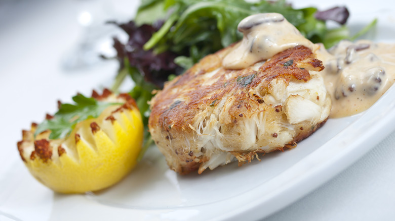 If you're using imitation crab in crab cakes, though, there are a few things to bear in mind. It's best to pulse the imitation meat in a blender to break it up slightly so that big lumps don't ruin the consistency of the cakes. This is a fine balance, though, as if you blend them too much, they'll turn into a paste — so stop when they've reached a flaky consistency. Imitation crab is also way lower in protein than regular crab meat, so you might find that your crab cakes satisfy your hunger slightly less.