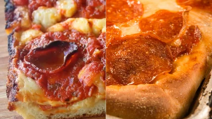 Sicilian pizza, on the other hand, originates from Italy and its crust tends to be more dense and focaccia-like, where it's crispy on the outside and lighter on the inside. It's also a bit thinner than Detroit-style. Cheese and toppings typically go on top of the sauce, which is more akin to traditional pizza.
