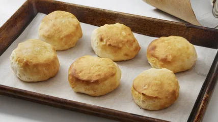 If you want your canned biscuits to taste more like the type of homemade, straight-from-Grandma's-kitchen kind of biscuits you get in the South, you should be pan-frying them. To start, grab a can of biscuits, some butter, and a big skillet. Then, open the can of biscuits. If you're using Pillsbury Grands Biscuits (which work great for this recipe), you should have eight biscuits. Separate them from each other and take off the top half of each one (they should all still be circles of dough) to make 16 biscuits total. If you're using another kind of canned biscuit, you may have to cut them in half with a knife instead of just pulling them apart, or you can just leave them as-is.