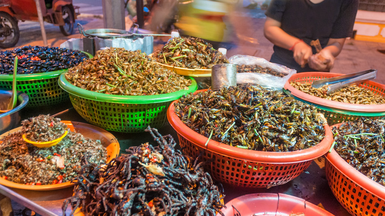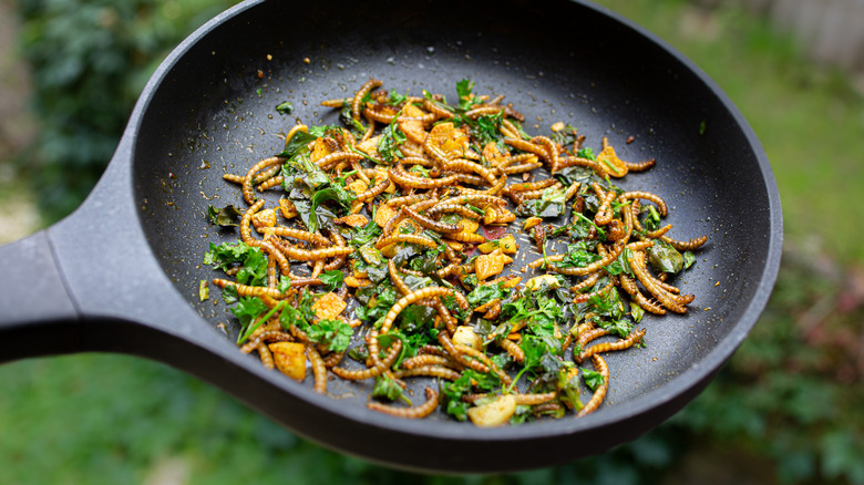 From crawling to flying to tunnel-digging bugs, brothers Brian and Scott tried a wide variety of insects and then shared their thoughts in a Q&A with Mashed. Most of their spread was made up of bugs with exoskeletons (arthropods), the only exception being worms (which often fit into the annelid group). The exoskeleton's texture was relatably described by Scott as "a popcorn kernel husk" and the flavor, "pretty earthy. Like ... violently earthy!!! Like eating dirt." This should come as no surprise, given that bugs spend most of their lives nestled amongst plants and decomposing earth.